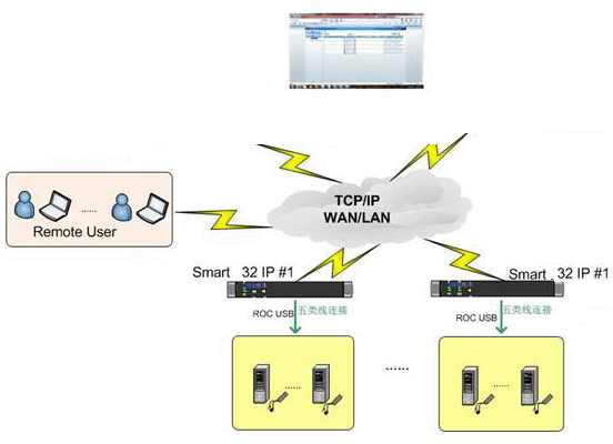 方案由2-3台32口IPKVM和2-3台300米控制端以及和服务器数量相当个ROC USB服务器连接模块组成