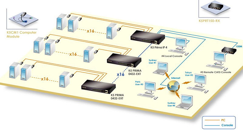 选用1台矩阵式IP KVM KRV-4132 系统可以支持4个用户同时对数据中心主机房中32通道进行集中管理。其中包含2个远程用户和一个本地用户以及一个远端CAT5用户可以同时访问中心机房内的400台服务器。