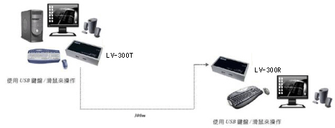 将接收器放置于远端主机要延长的位置,您可以使用随机附带的软磁性底座或可活动式金属底板将其固定至适合的位置。再将显示器、键盘、鼠标及音箱连接至接收器相应的接口后,接上电源。