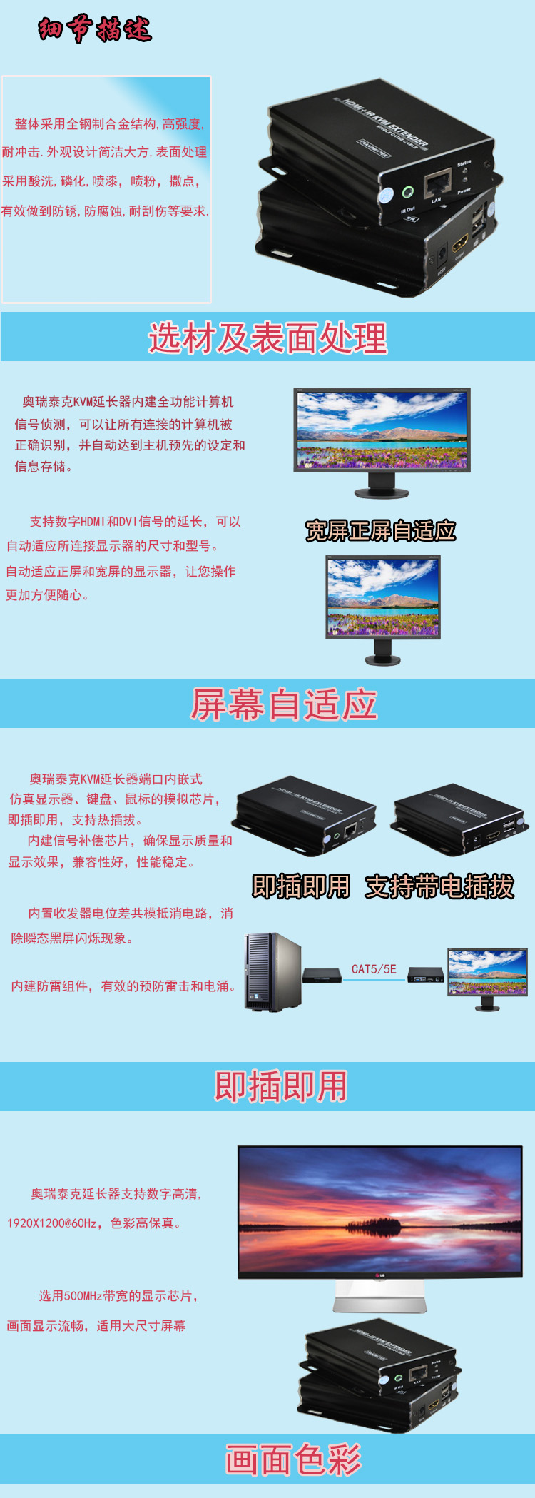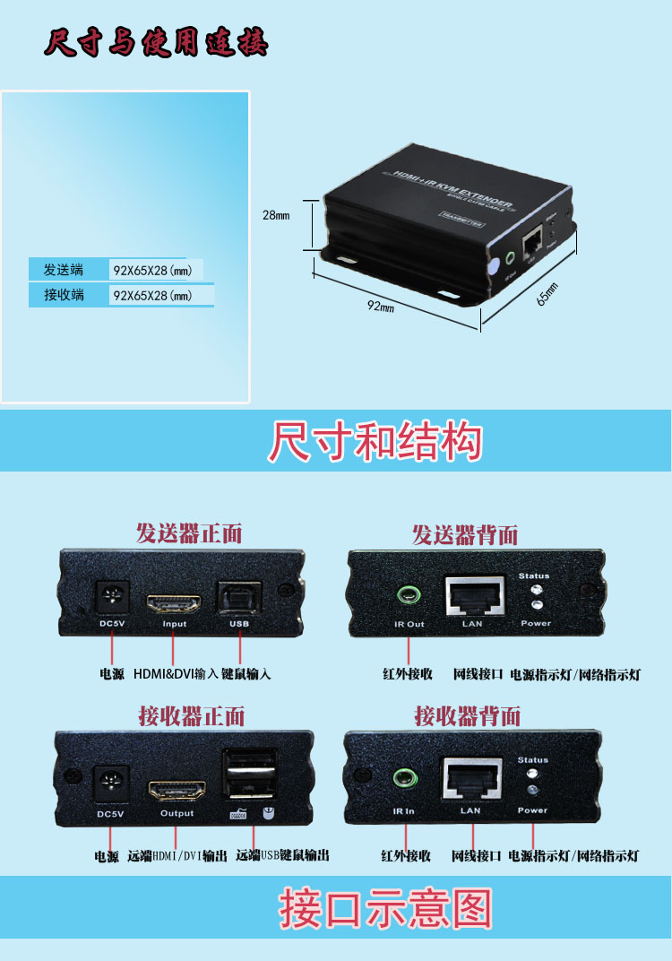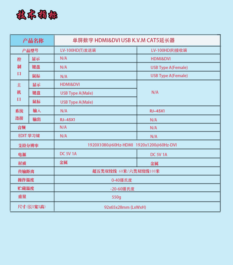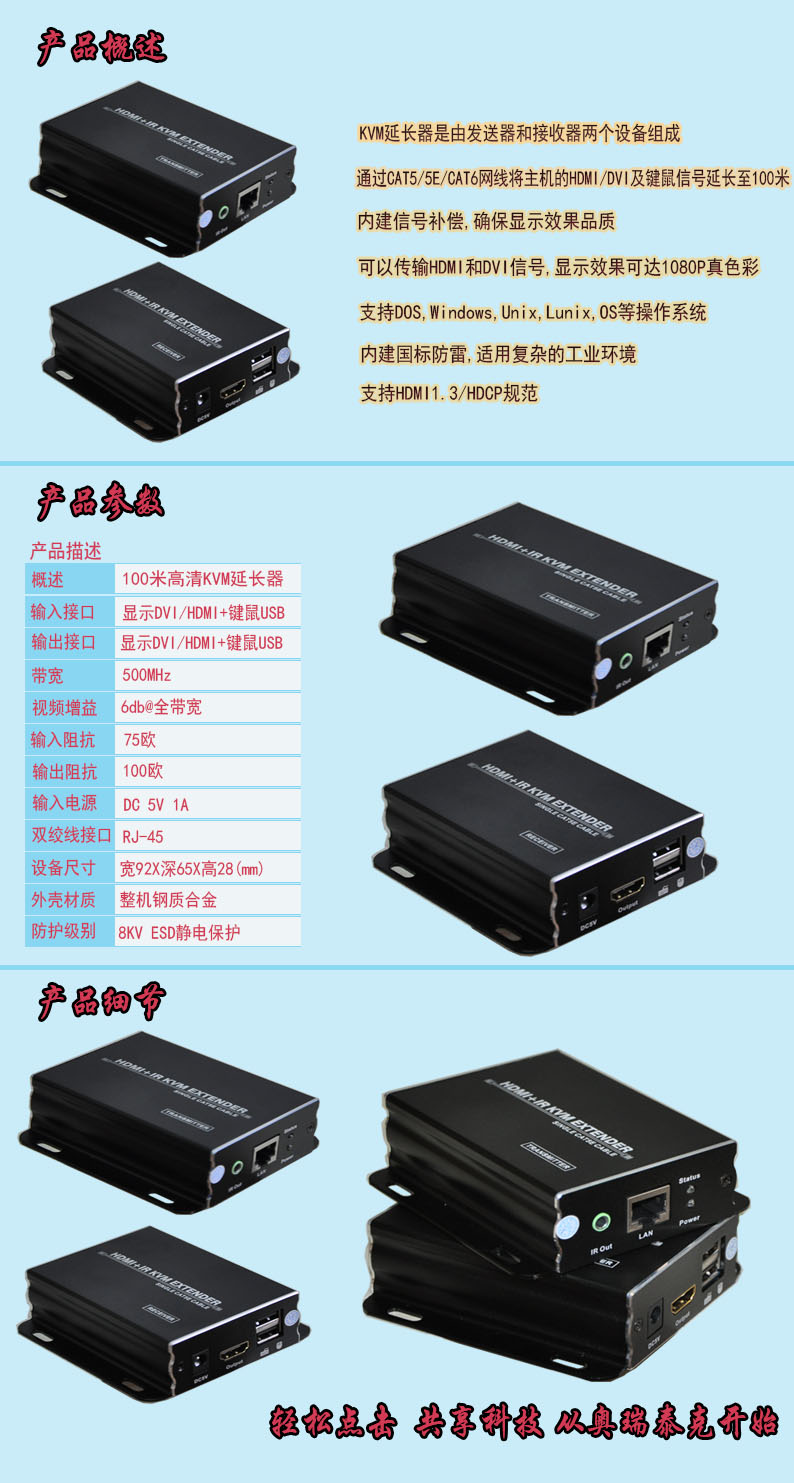 描述:单屏数字HDMI&DVI KVM CAT5100米延长器