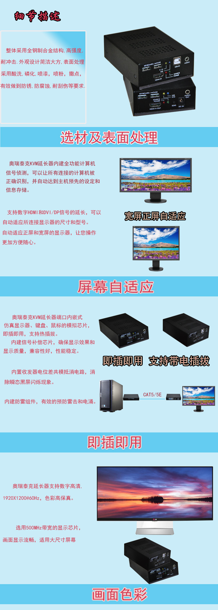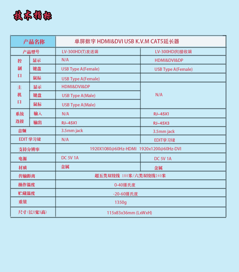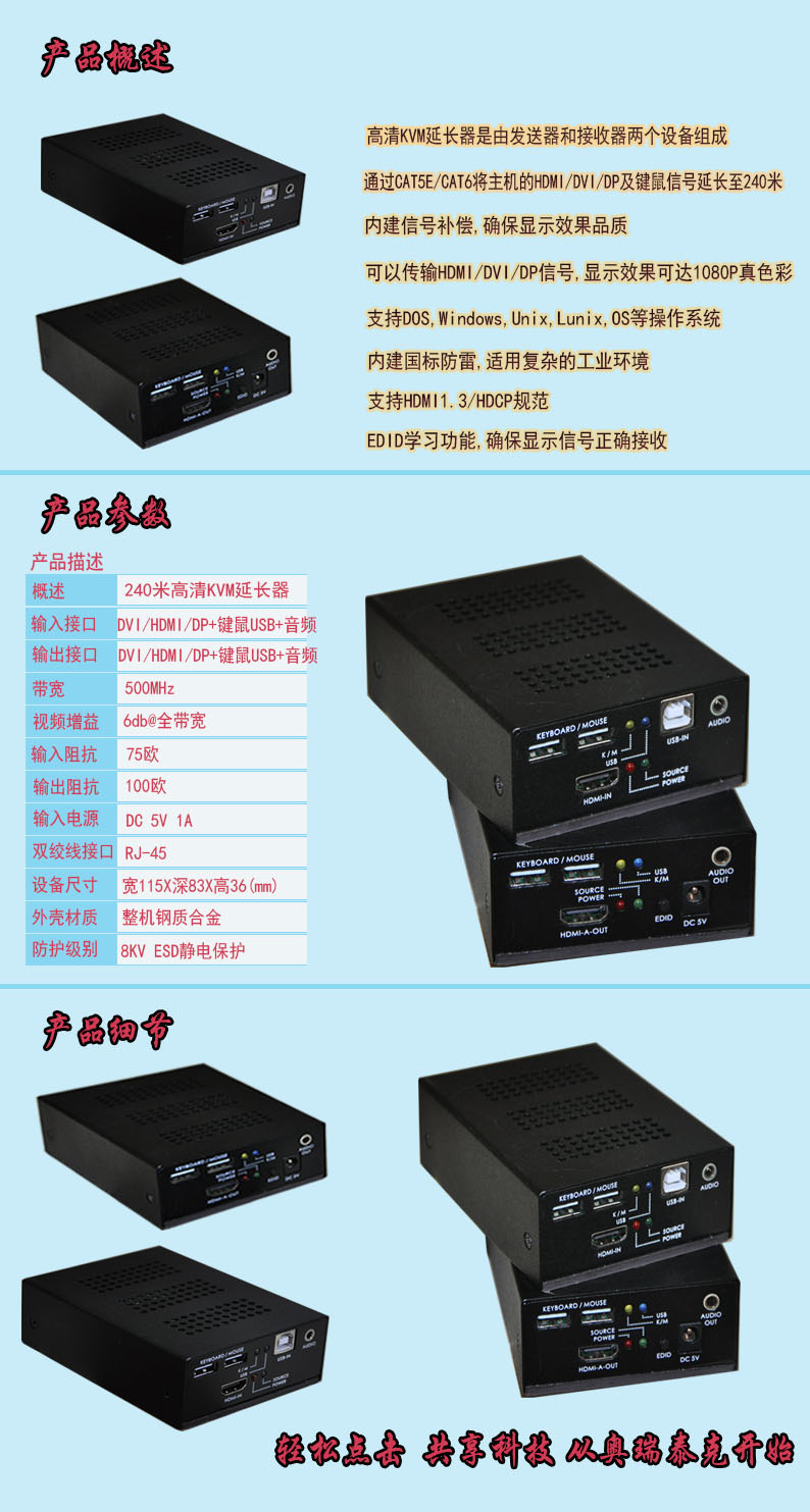 描述:单屏数字HDMI&DVI&DP KVM CAT5300米延长器